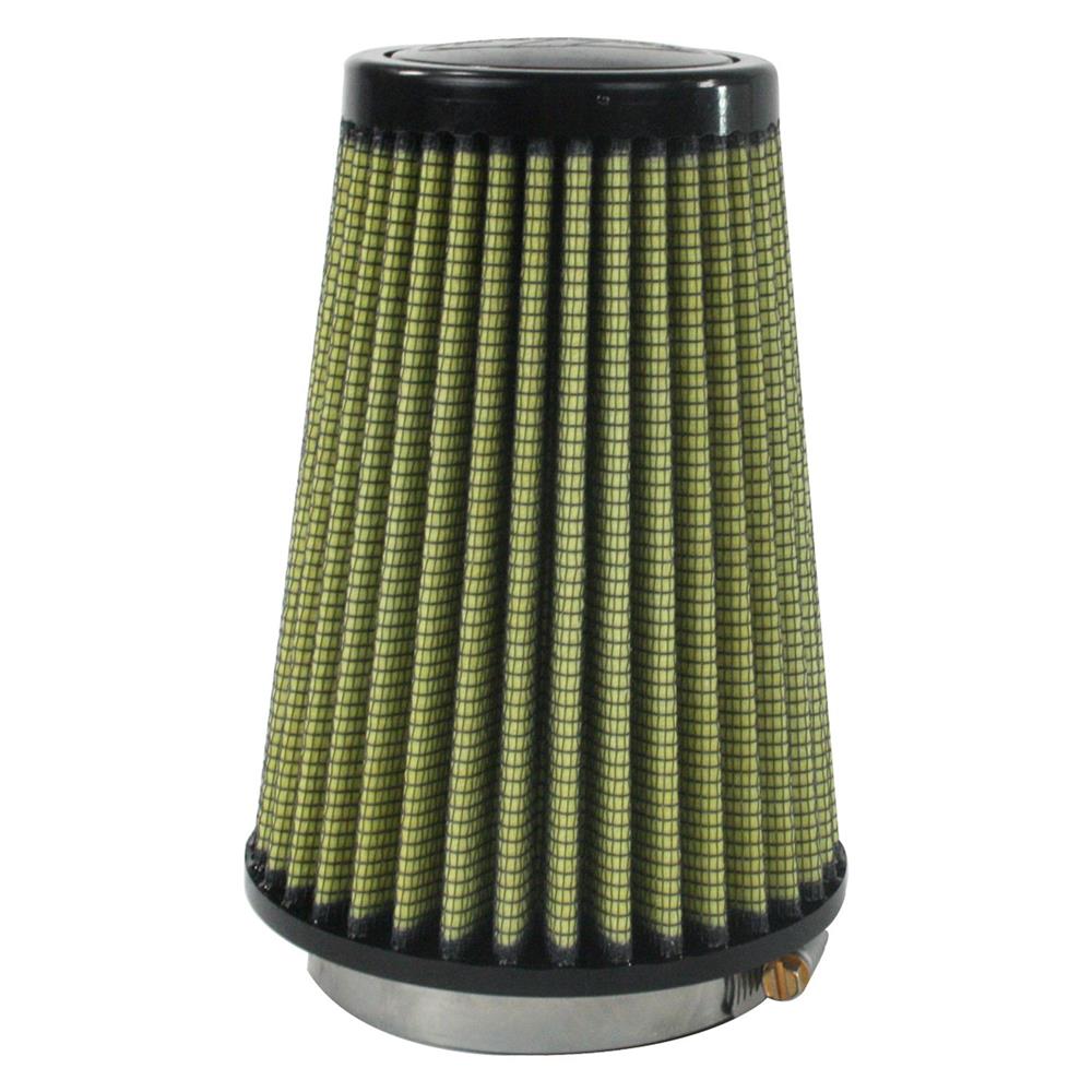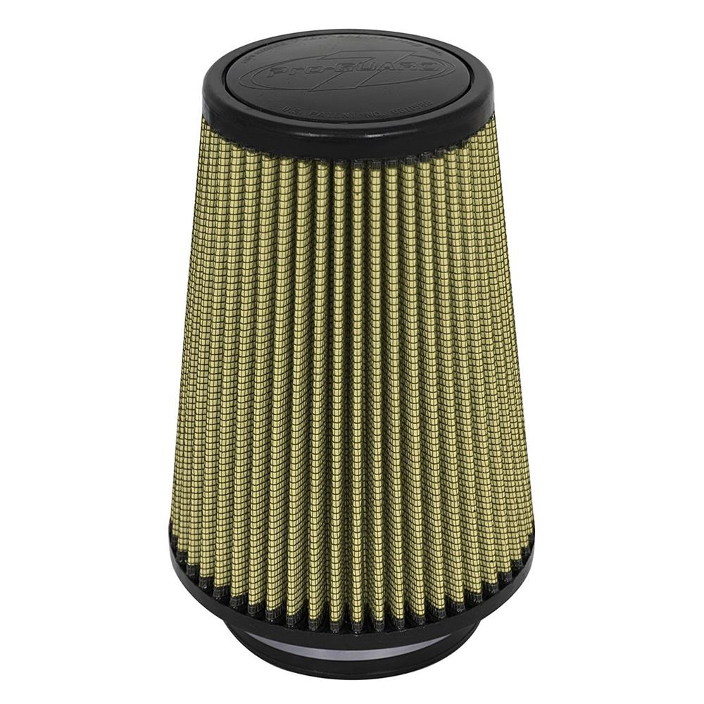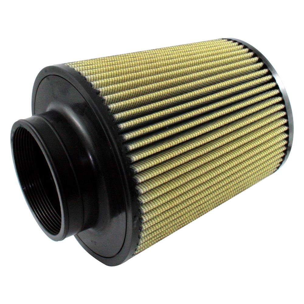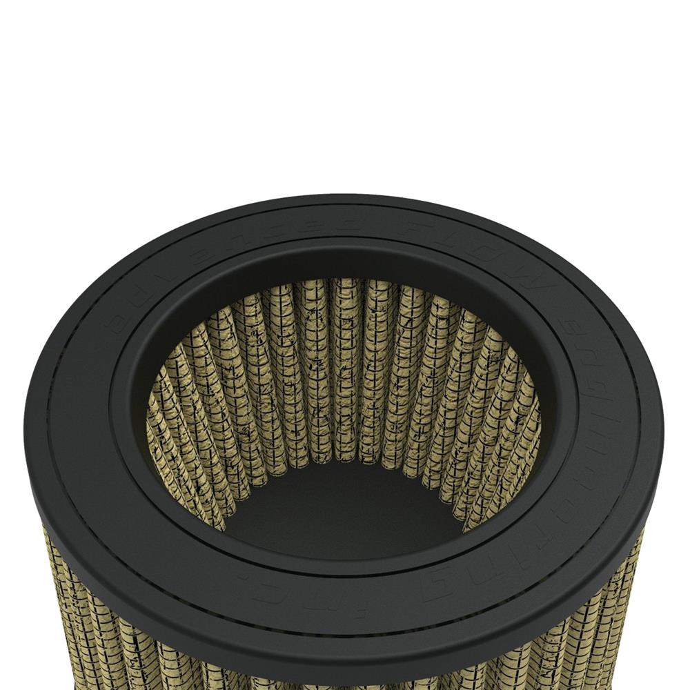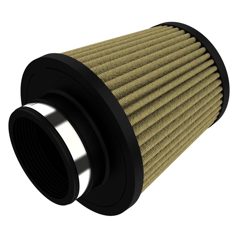 Magnum Flow® Pro Guard 7 Tan Air Filter by aFe®. This Pro Guard 7 performance air filter outflows the factory intake by 44%. The “Inverted” design of this unique OE replacement filter fully utilized the space in the stock air box to provide the most filter media of any “drop-in” OE replacement filter. With seven layers of progressively finer mesh cotton gauze/synthetic media, this high flow “oiled” OE replacement performance filter provide maximum protection with highest cumulative filtration efficiency for severe duty environments. Washable and reusable for multiple cleanings, the tall open evenly spaced pleats provide excellent dust holding capacity for longer service cycle between cleanings. Integrated urethane bump seal insures tight, no leak seal over the life of the filter.