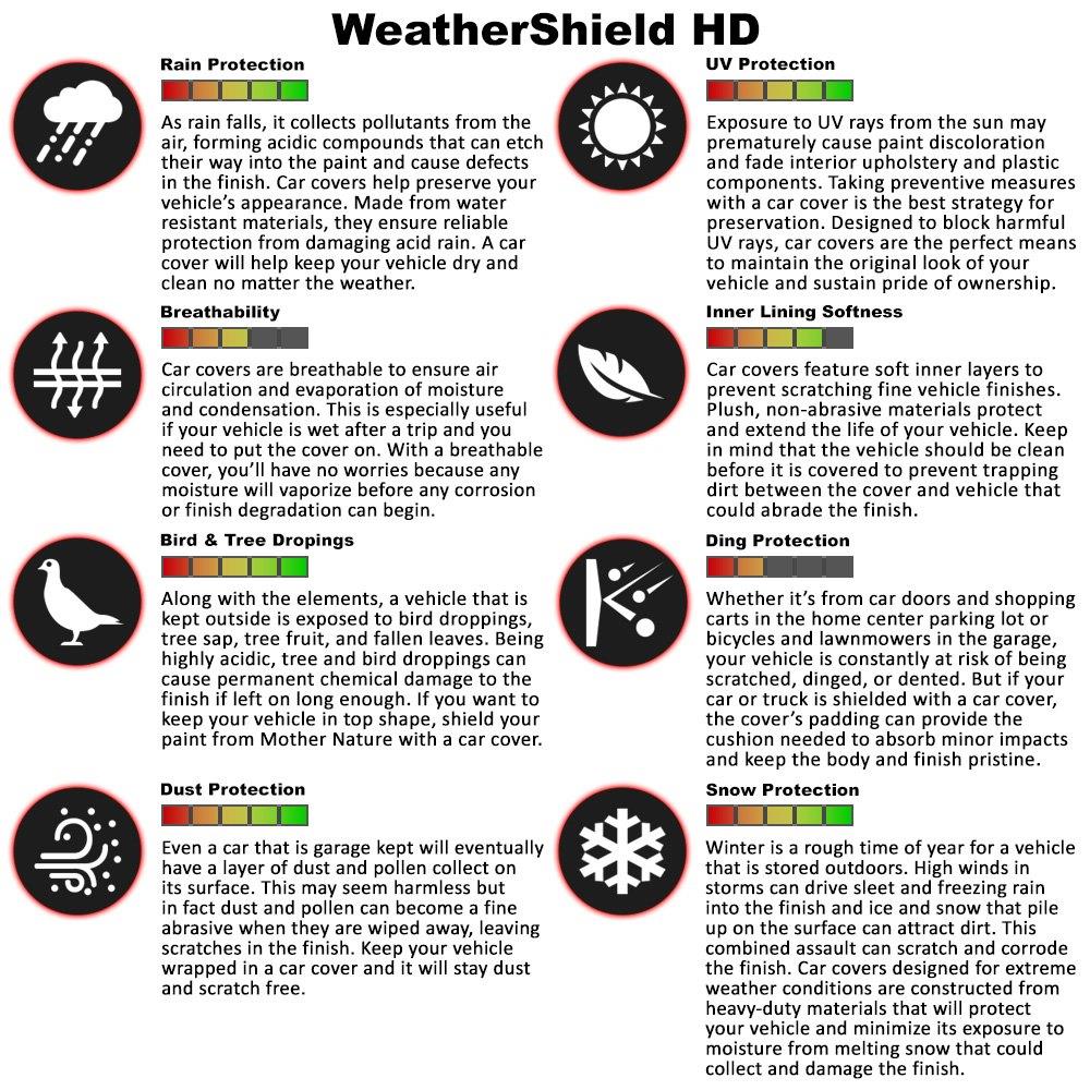 Designed specifically to give the highest level of protection in the most sun-intense environments thanks to fabric additives that reduce cover degradation after prolonged exposure to UV rays. Blocks dust, pollen, and tree sap better than any Covercraft car cover.