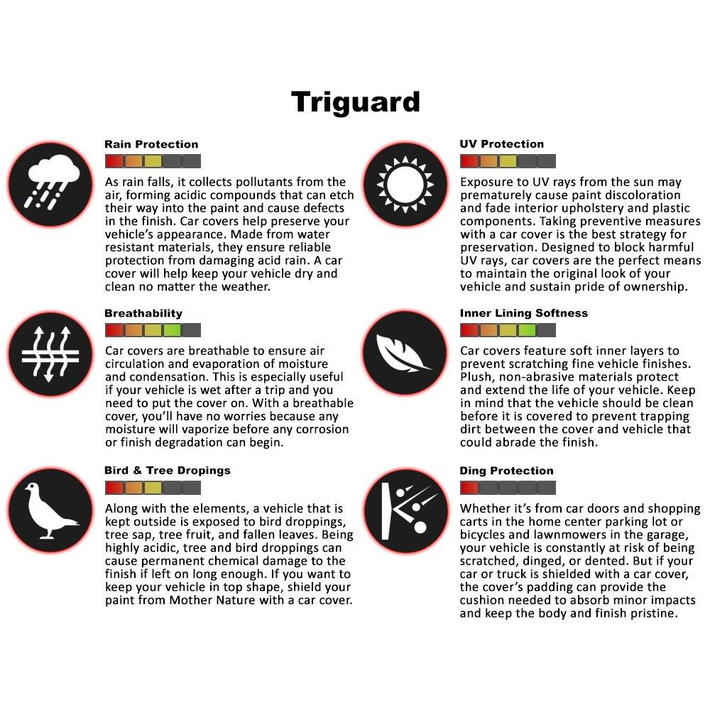 Triguard™ Gray Custom Car Cover by Coverking®. Coverking Triguard Vehicle covers are suitable for those who need protection against nicks and dings in light weather conditions. Made from three layers of fabric, this cover is durable and perfectly suitable for outdoor and indoor storage. With the Triguard custom cover, you can store your vehicle outdoors without worrying about damages to your car. Custom logos are available as an option for this product.