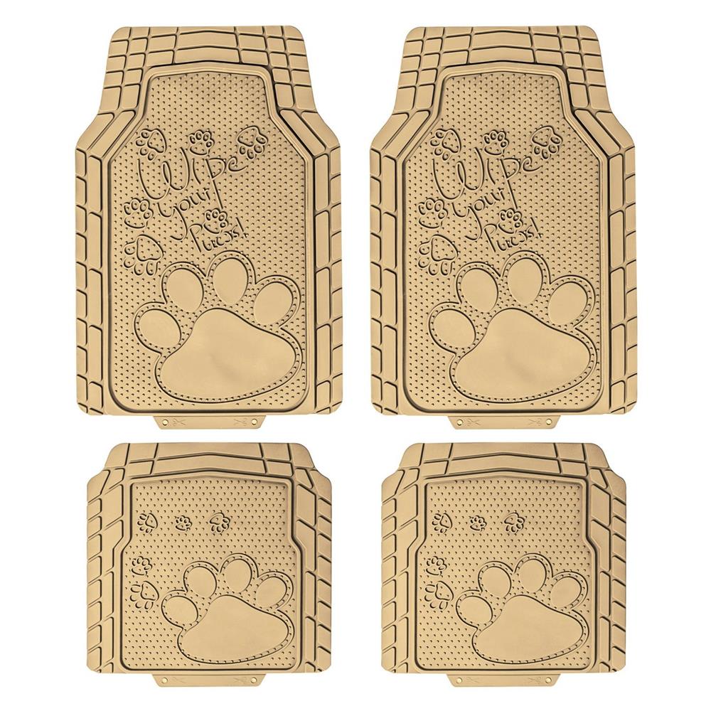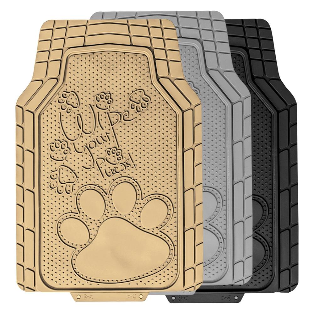 Universal Heavy-Duty 1st & 2nd Row Rubber Floor Mat Set with Adorable Paw Print by FH Group®. 4 Pieces. These feature a longer lifespan, deeper channels to trap dirt, mud and debris plus taller walls so even the biggest and baddest spills don’t stand a chance. Out trimmable ensures a perfect fit for your vehicle no matter what. Enjoy this rubber floor mat design for all your cars.