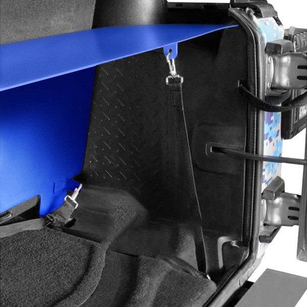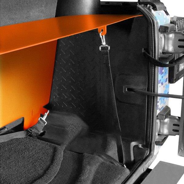 Rear Storage Box by Steinjager®. The one piece construction of the Rear Storage Box helps keep your precious cargo secure while in transit or when left unattended. Installation is a breeze, simply slide the storage box in place and attach the provided hold down strap. Straps will weave through the existing anchor points mounted to the floor.